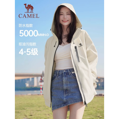 骆驼女装夹克2025春秋新款白色宽松连帽短外套女防风休闲外套男女